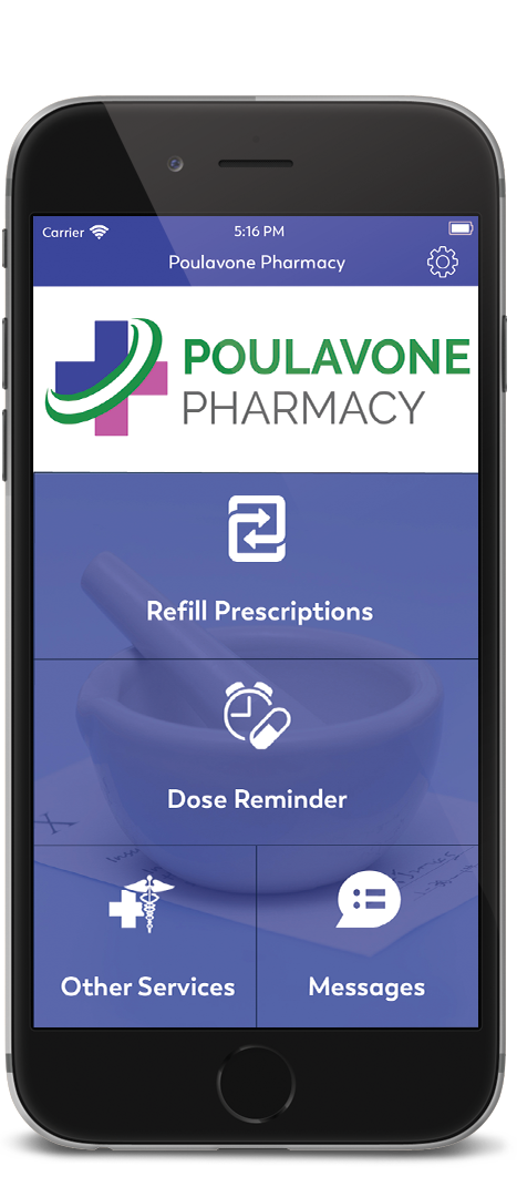 Download the Refill Assistant App, enter our code ”4874181” and select ”Poulavone Pharmacy”